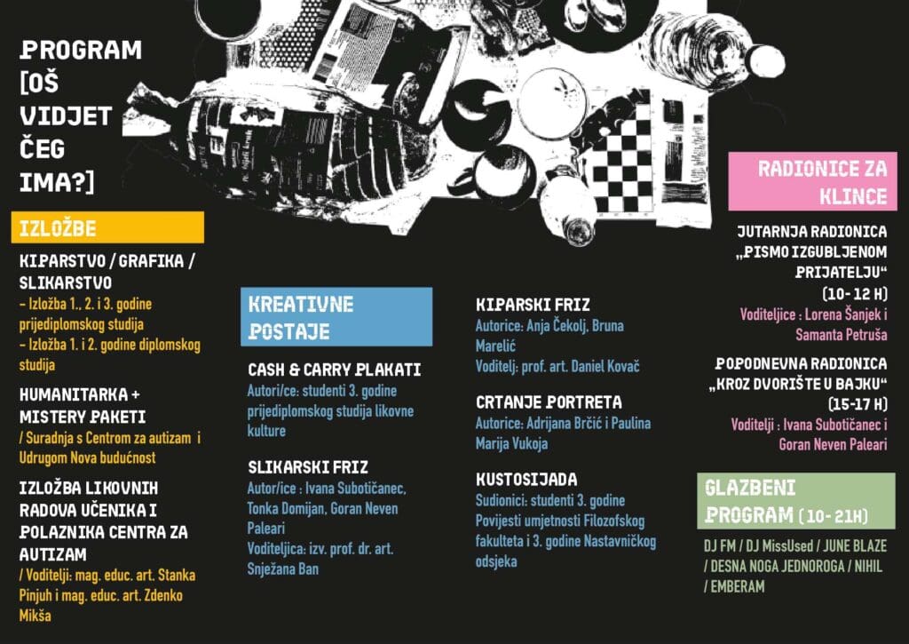 Uz izložbeni program, posjetitelje očekuju nastupi mladih glazbenika (Emberam, desna noga jednoroga, June Blaze, Nihil, DJ FM i DJ MissUsed) te edukativne i likovne radionice za djecu i odrasle, čime se prostor Akademije otvara široj zajednici.